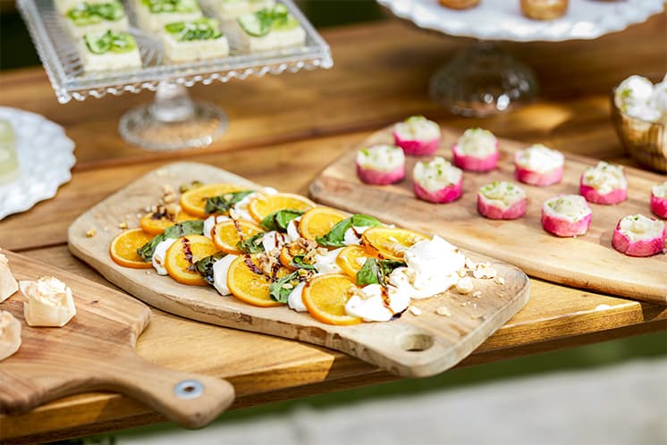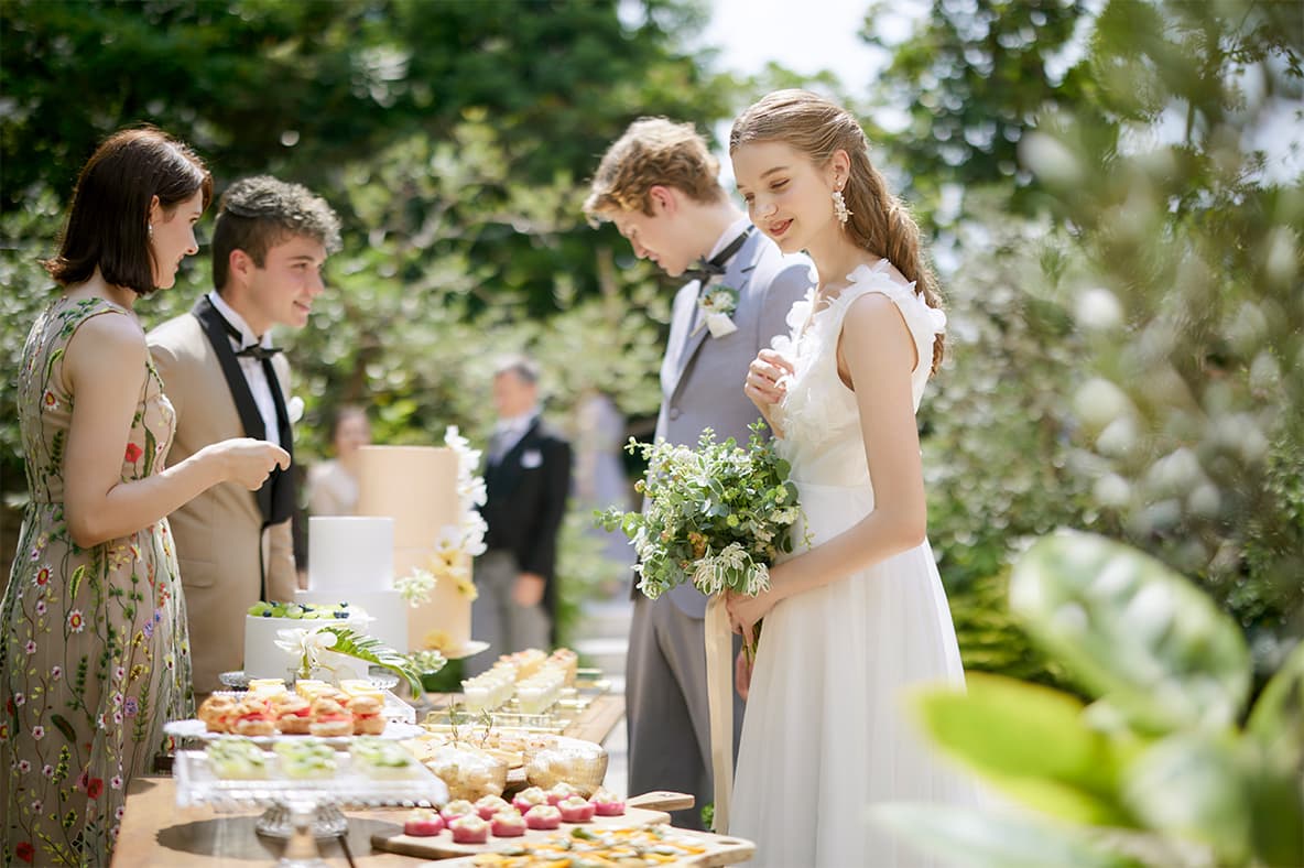 ゲストとの距離を縮めて、賑やかな時間を演出してくれるデザートビュッフェ。華やかにデコレートされたスイーツたちはどれから食べようか迷うほど。デザートを片手にゲストを語り合う素敵な時間を。