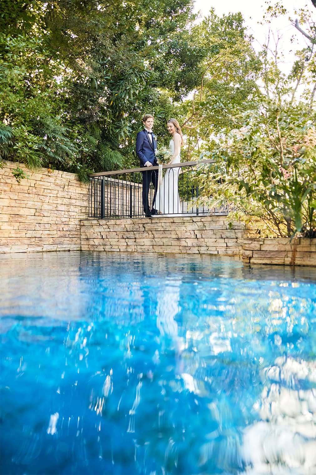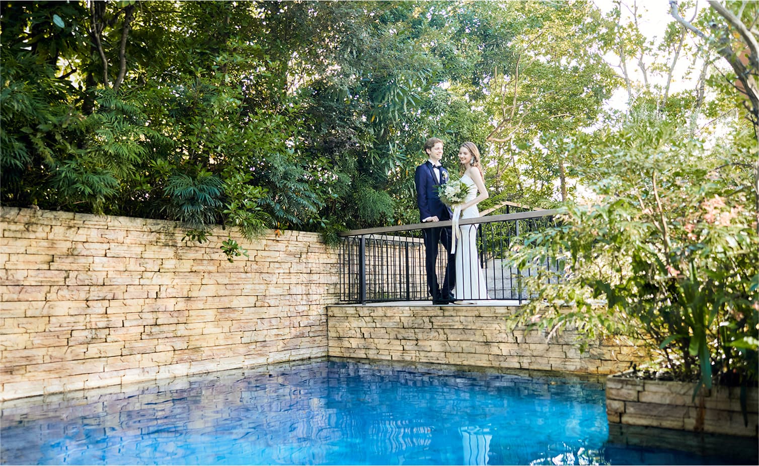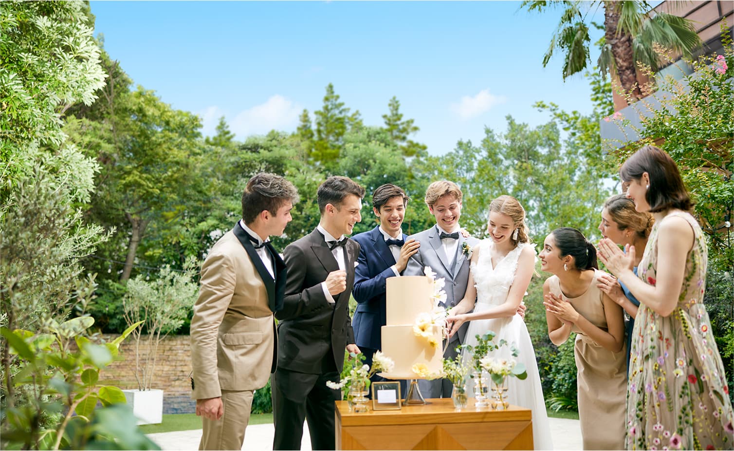 ガーデンに広がる芝生の周りには、優しい風に揺れるパームツリー、スタイリッシュなプールなどリゾート空間が点在しています。どうぞお好きな場所で、ゲストの皆様とウエルカムドリンク片手にゆっくり談笑したり、デザートビュッフェでスイーツやお茶を楽しんだりと、特別な時間をお過ごしください。