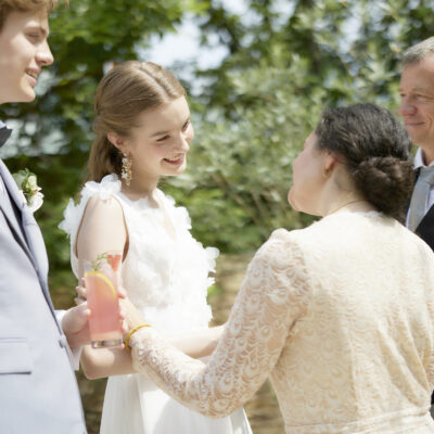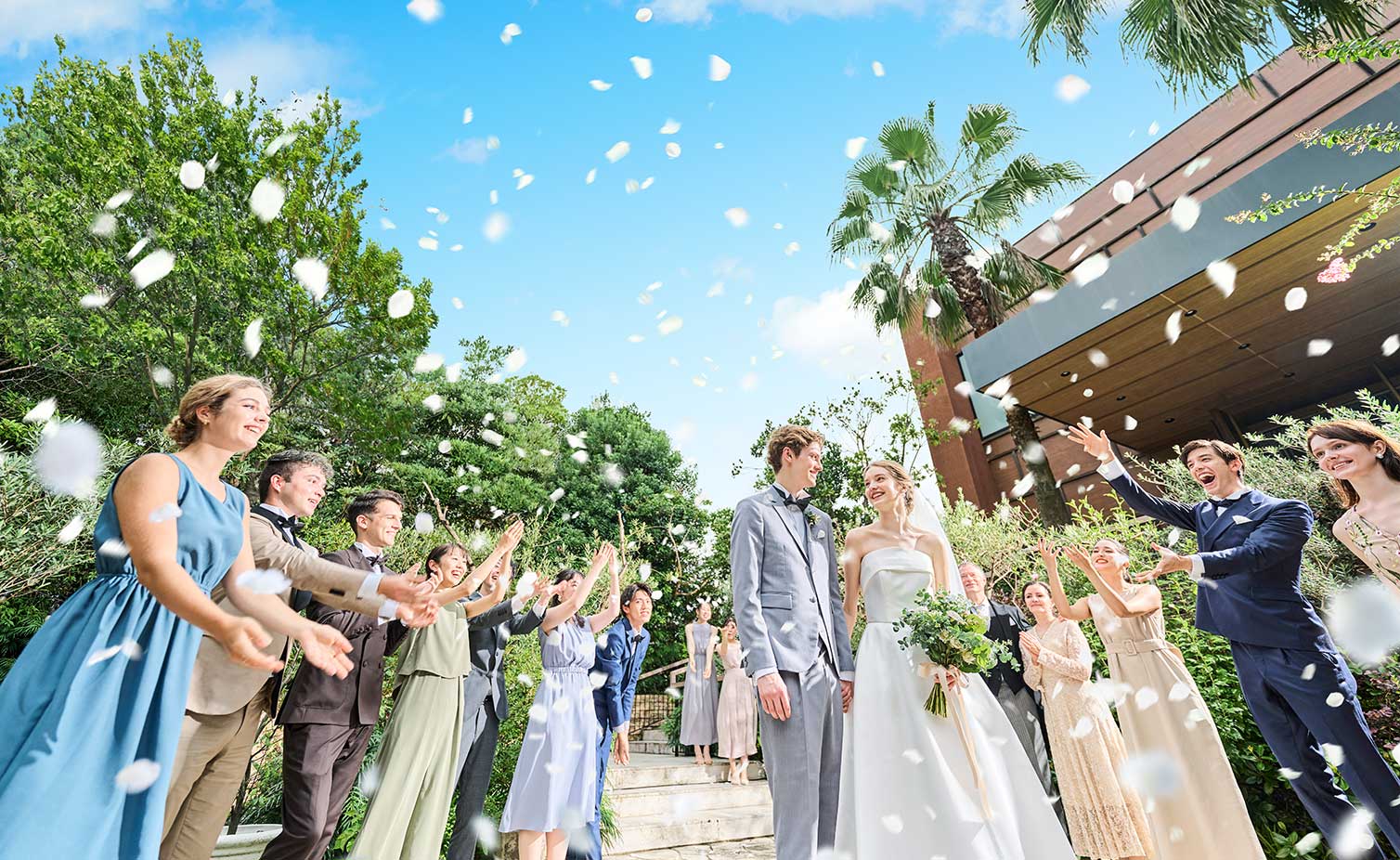 誓いのあとには、アフターセレモニーの祝福を。開放的な青空の下、フラワーシャワーやバルーンリリース、フォトタイムとおふたりらしく自由に、大切なゲストとお過ごしください。