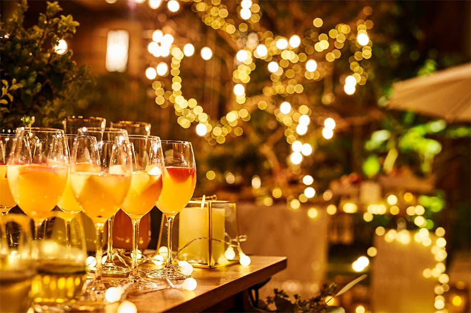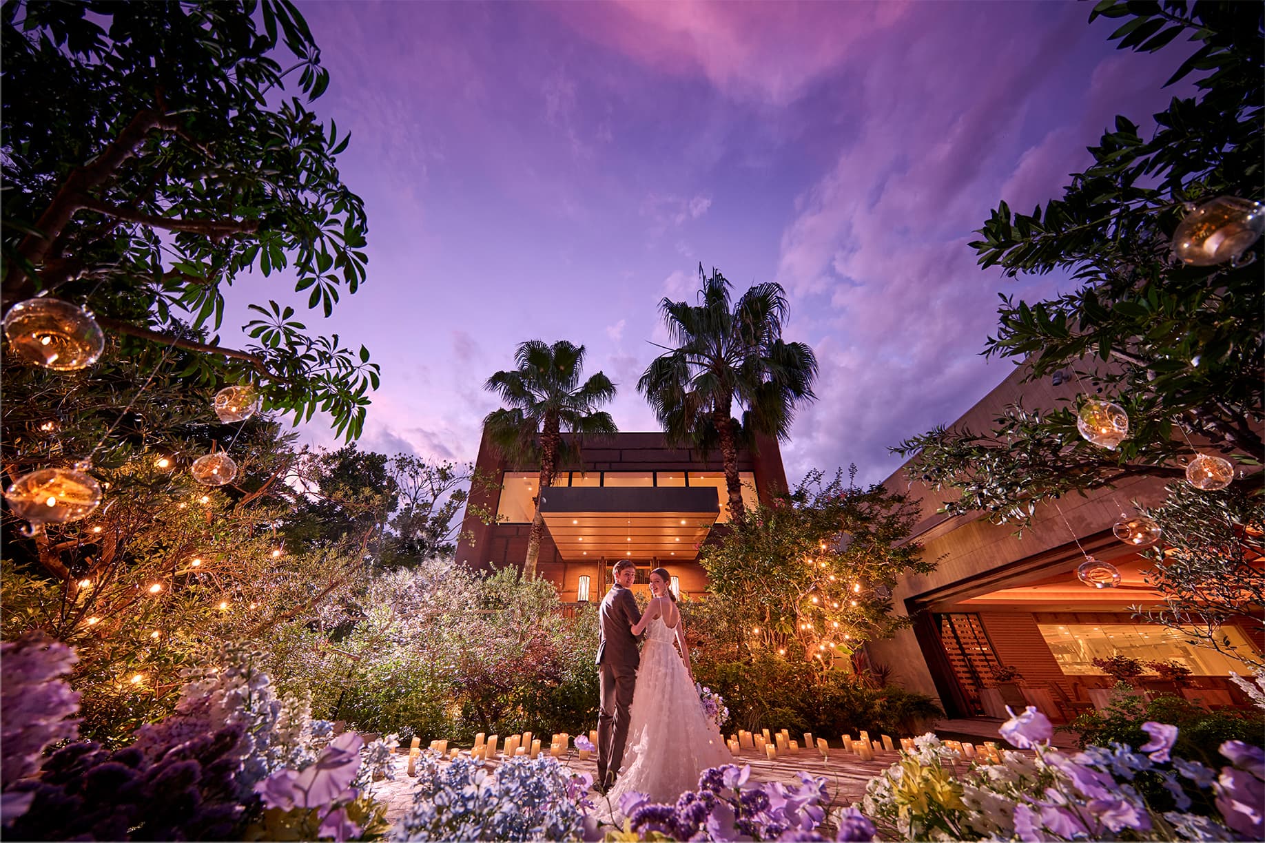 夜空に輝く星、優しい月明かり、揺れるキャンドルの光、眩いライトアップ。まるで別世界への扉を開けたような風景が、目の前に広がります。この上ない特別なステージで、その場に立ち会うすべての人々の心に響くナイトウエディングパーティをお届けします。