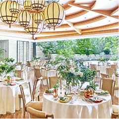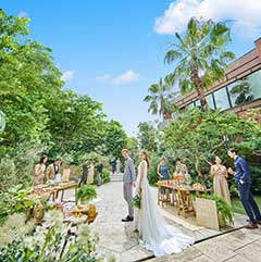 陽光とやさしい風が入り込む緑に囲まれたガーデン。パーティ会場の大きな扉を開けると、ガーデンと繋がり、さらに広々とした空間に。貸切で行うアフターセレモニーやビュッフェ等、新郎新婦はもちろんゲストにも好評。邸宅を貸し切って大切なゲストとゆったりとしたパーティをお過ごしください。
