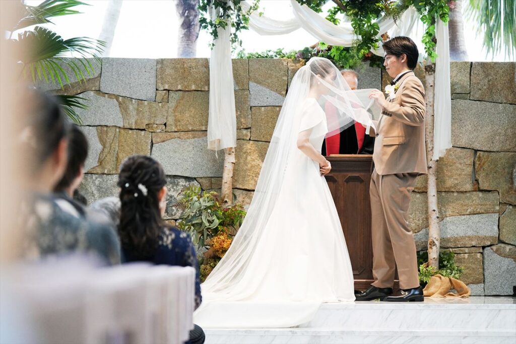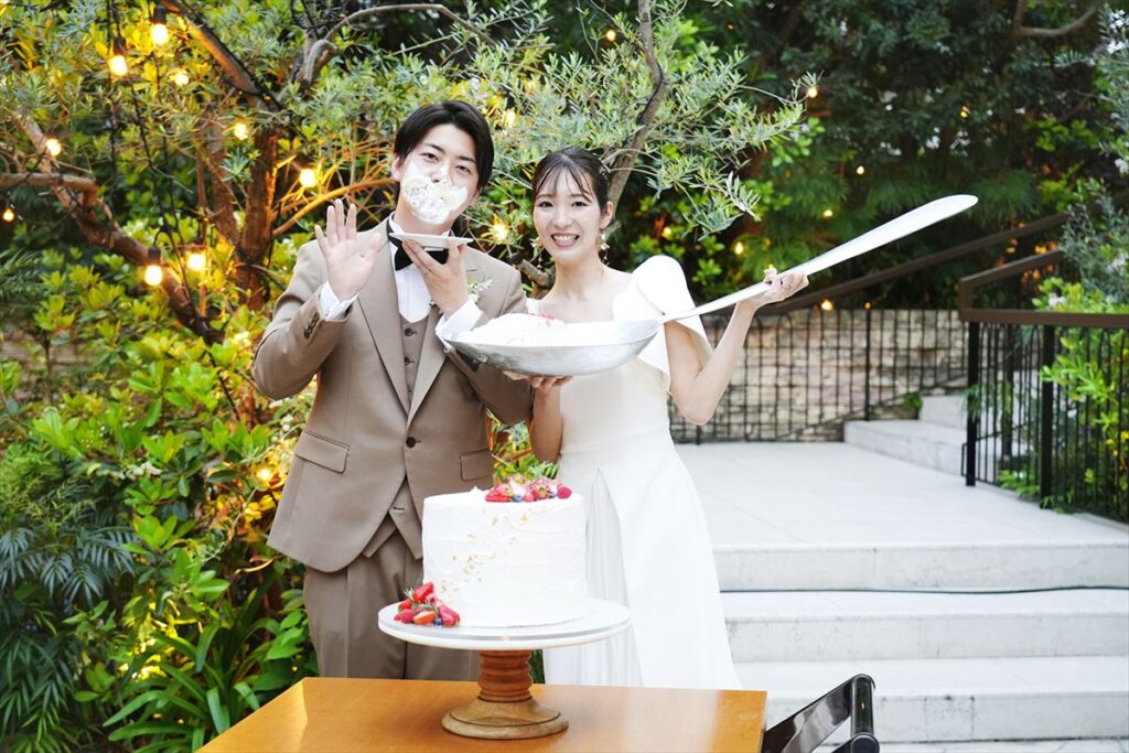 挙式では、厳かな雰囲気が漂っておりましたが、とても可愛い小さな助人達と温かい笑顔で見守ってくれたゲストのおかげで、リラックスして挙式を進めることができました。披露宴では、写真撮影や新郎新婦クイズを通じてゲストのたくさんの素敵な笑顔を見ることができ、【ゲストと一緒に楽しむ】という目標を達成できたと思います。ケーキセレモニーで新郎の念願であった超BIGスプーンによるファーストバイトを新婦がサプライズで用意され