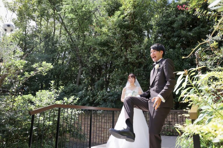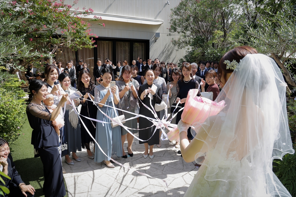 晴れやかな青空のもと祝福のフラワーシャワー!女性ゲストの皆さまには『コスメブーケプルズ』をしてプレゼント。そして、男性ゲストの皆さまは『サッカーボールトス』で盛り上がりました!