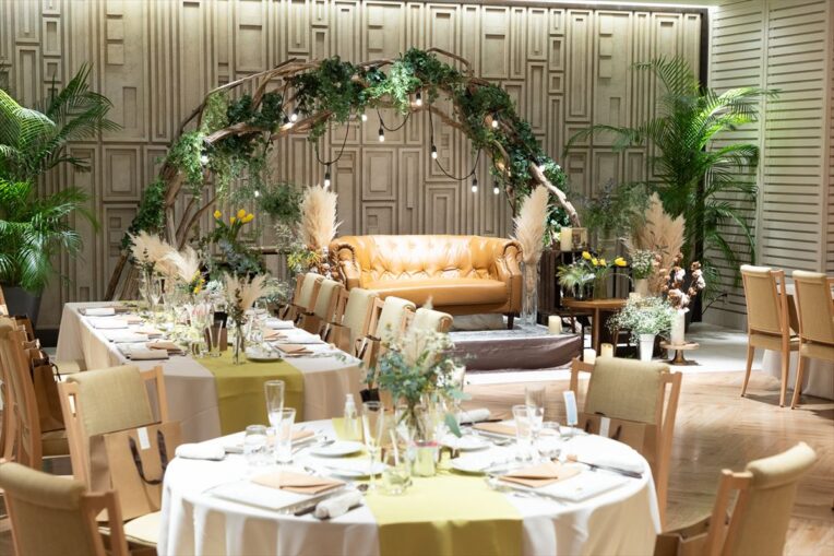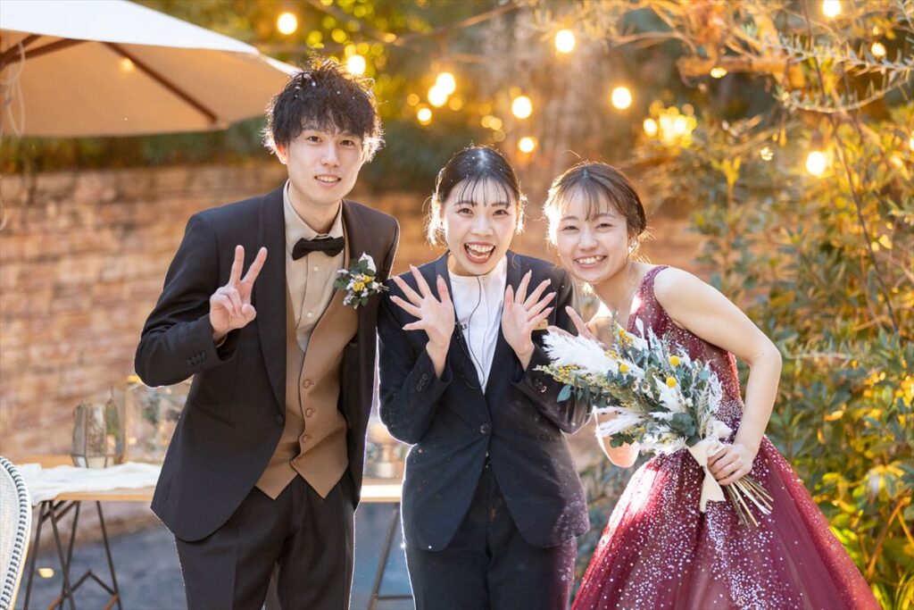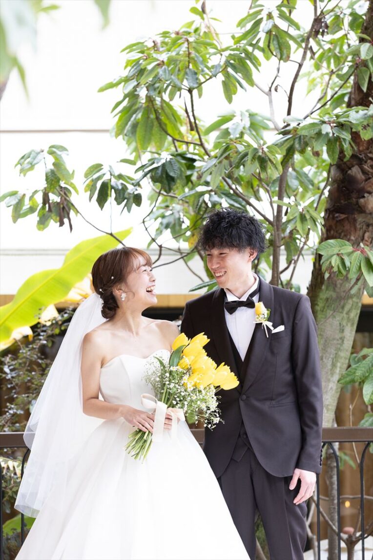 人前式では、ゲストの皆さまの前で誓いを立て、植木鉢におふたりの大好きなお花ミモザを納めた植樹式を行いました。