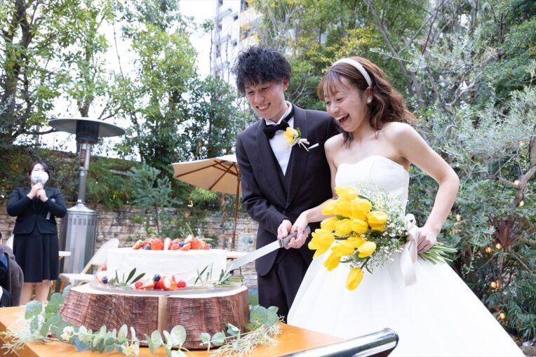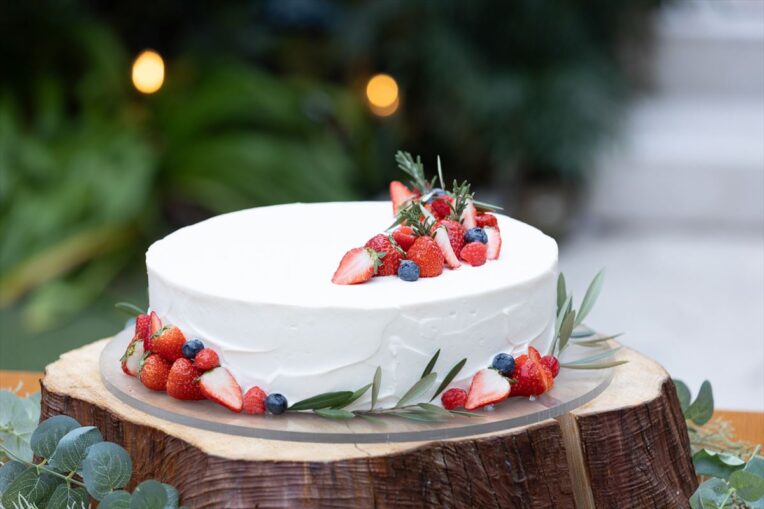 メインイベントのケーキセレモニーではいちごとブルーベリーが乗ったウエディングケーキが登場。
