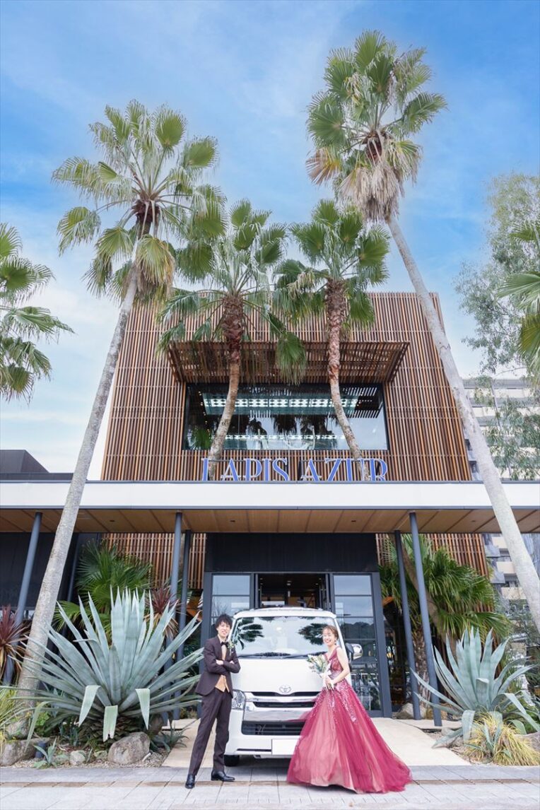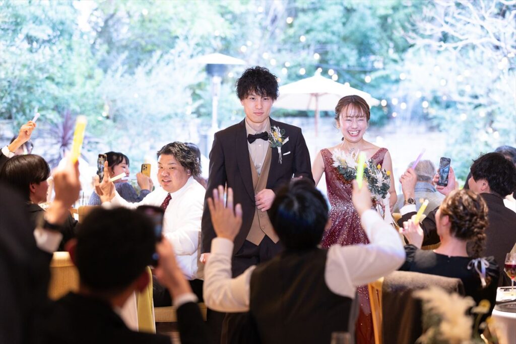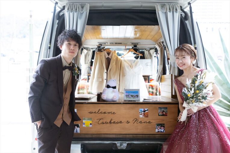 おふたり共通の趣味であるキャンプにちなんだ、つばささんとななさんがDIYされたウェルカムカーがゲストをお迎えします。