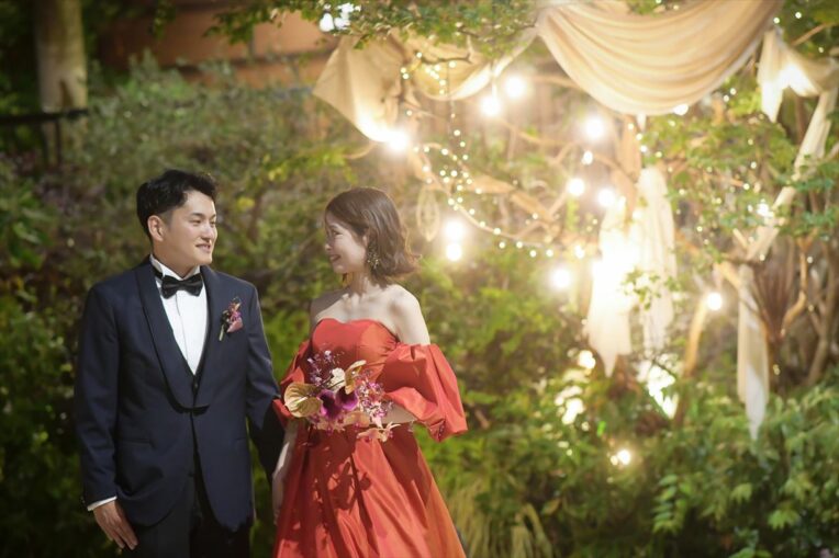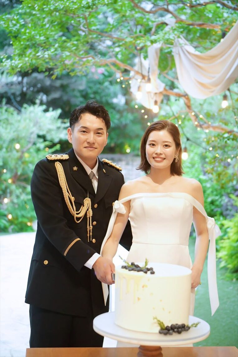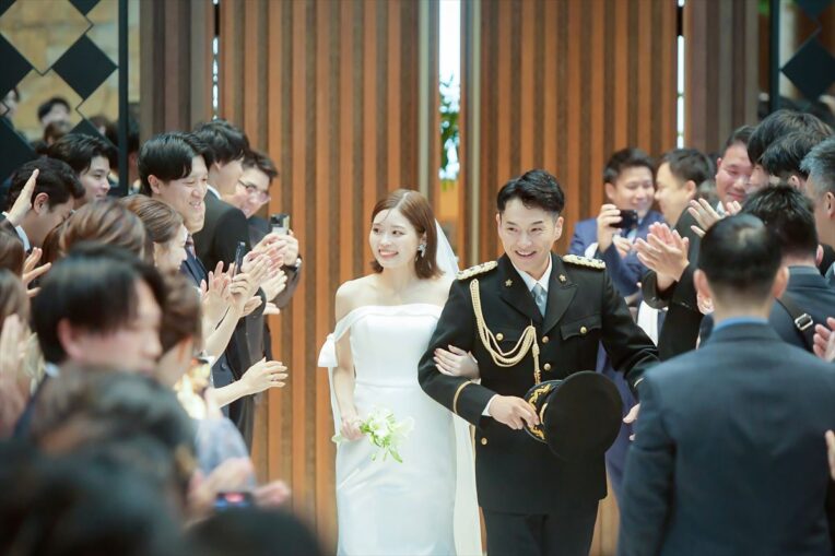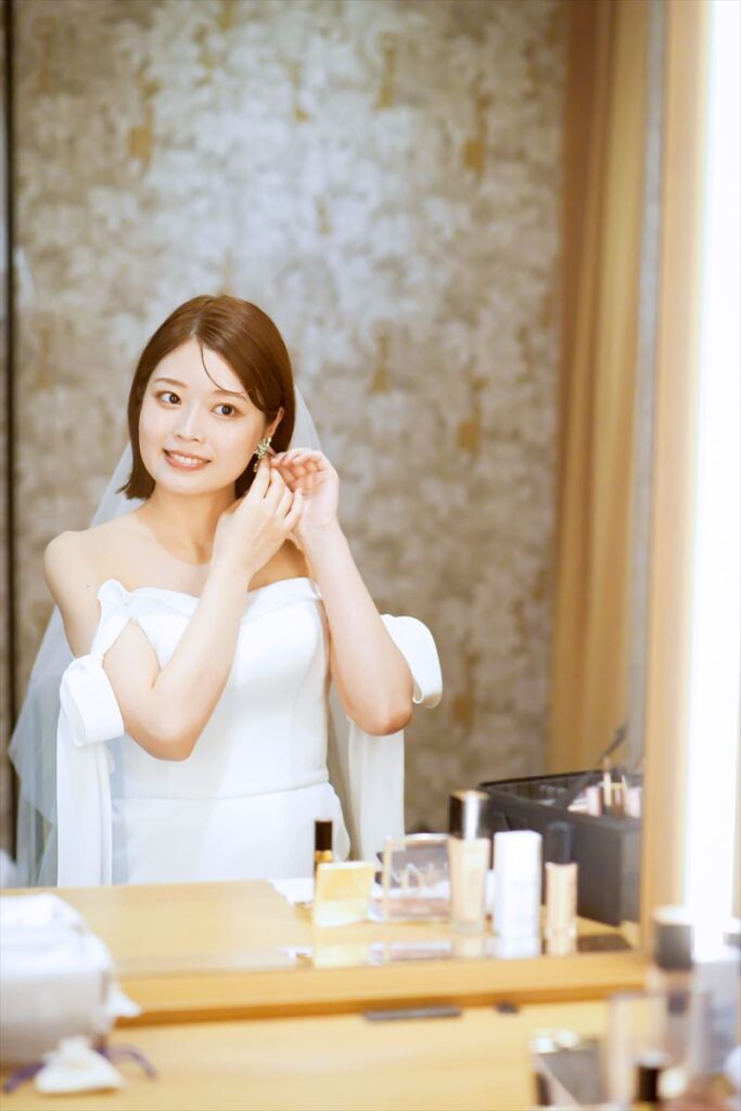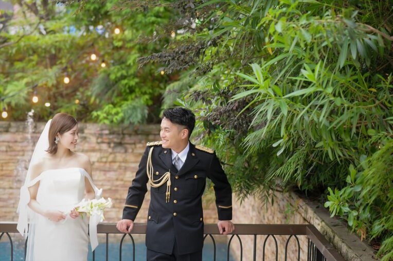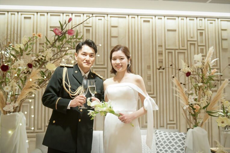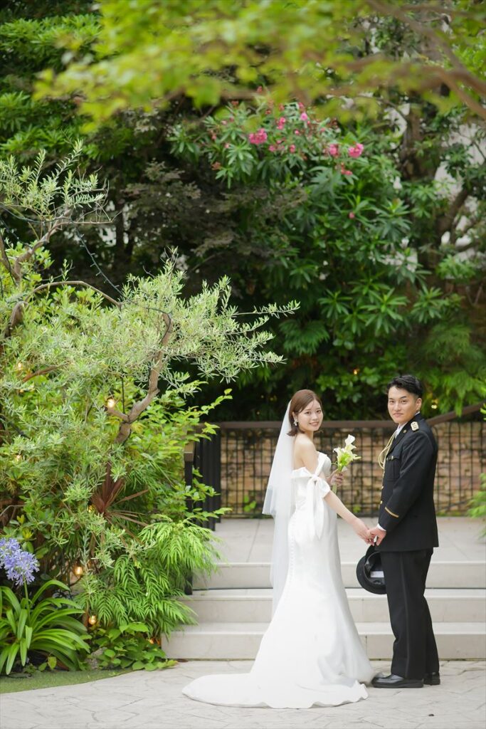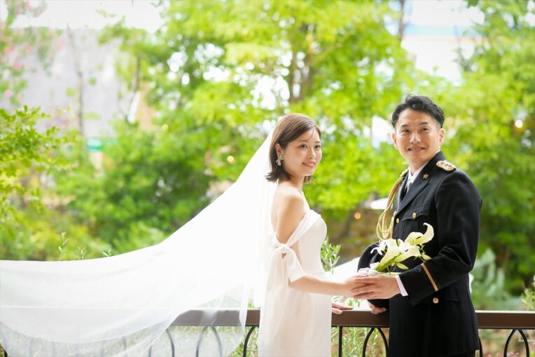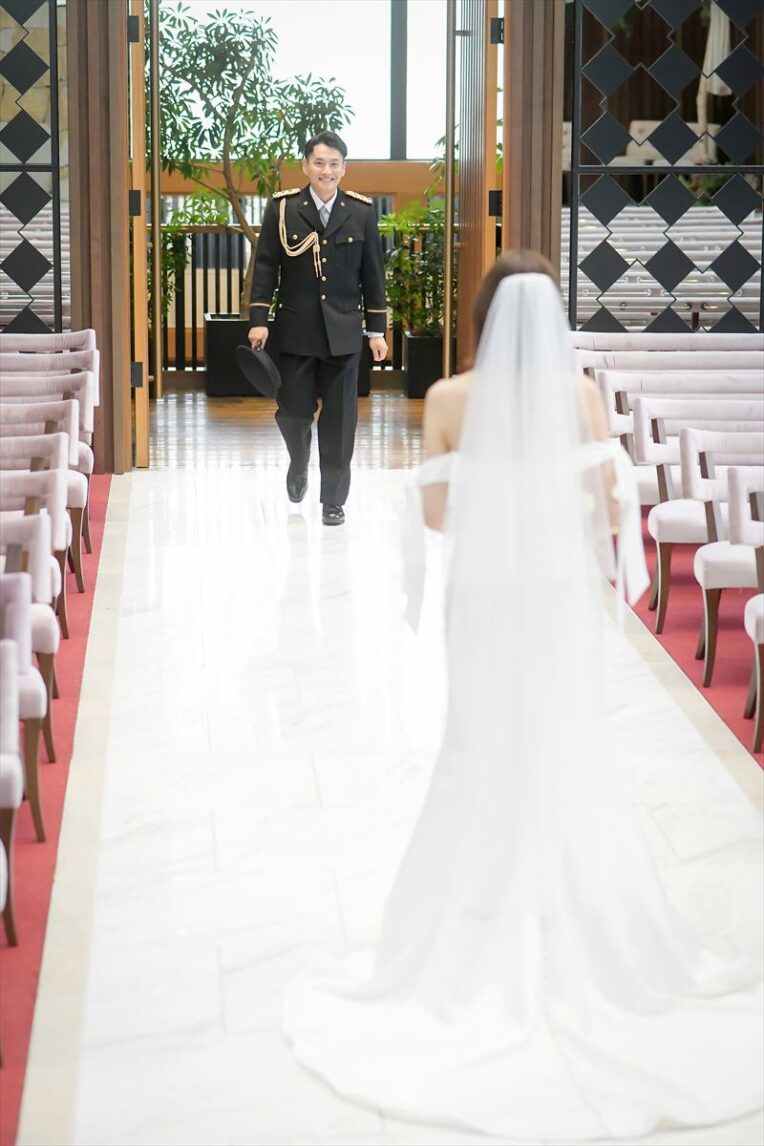 お互いの晴れ姿に少しドキドキしながらも、ウェディングドレスと儀礼服に身をまとい、新郎新婦としてのお姿でお互いへ気持ちを届けます。