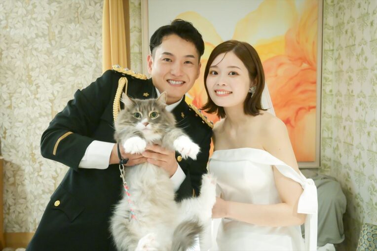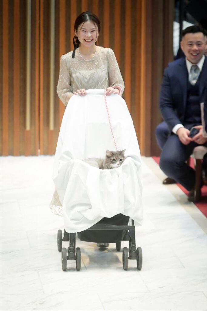 おふたりの愛猫「はっせん君」に指輪を届けていただくリングキャットのシーンは、ゲストの皆さまも温かい眼差しで見守ってくださいました。
