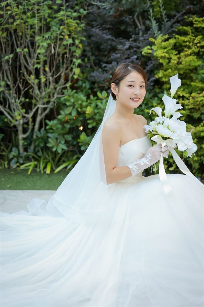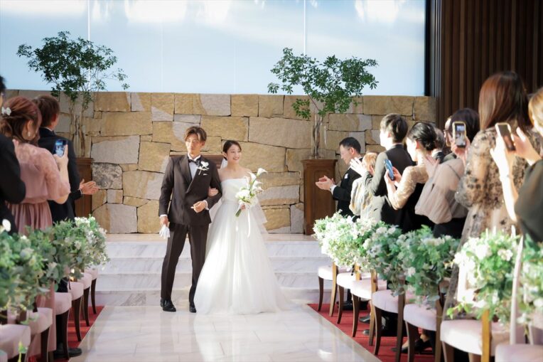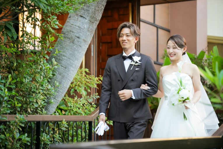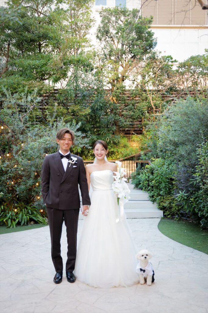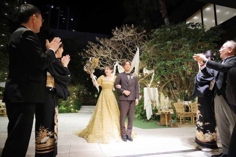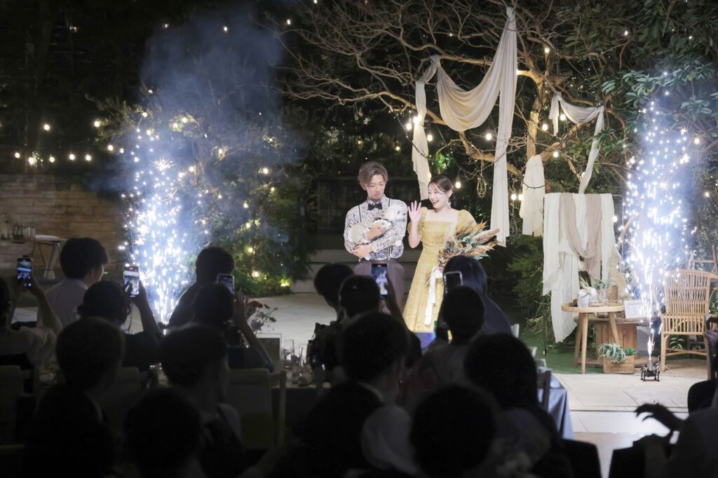 パーティの後半は、おふたりともにナイトガーデンに映える装いにチェンジ。花火とともに入場され、ゲストの皆さまから歓声があがります。