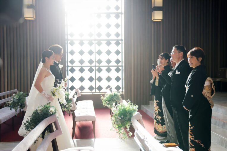 挙式前にファミリーミート。両家の親御様に感謝の想いを伝え、しっかりと握手を交わします。
