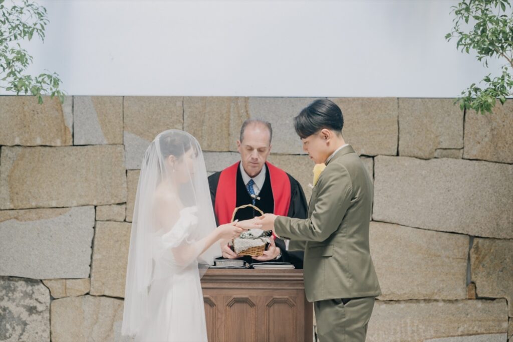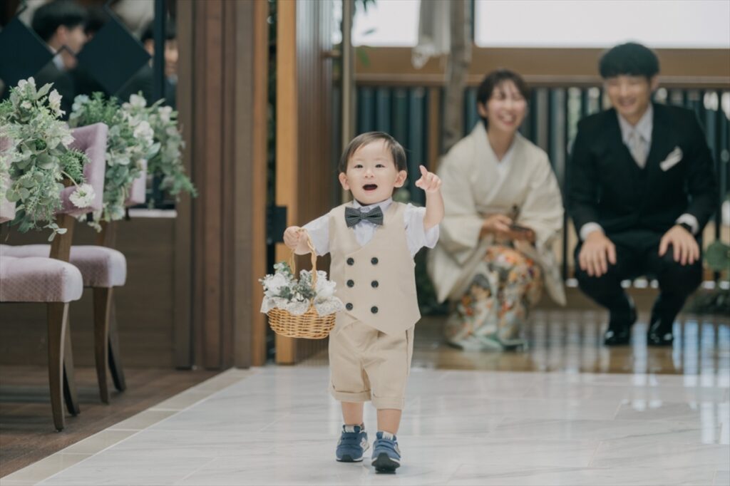 おふたりは教会式を選ばれました。たいせつな愛の証である指輪は、あおいさんの甥っ子くんが大事に届けてくれました。お越しいただいたたいせつなゲストの皆さまからの拍手の中、おふたりの愛が誓われました。