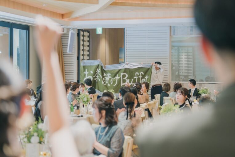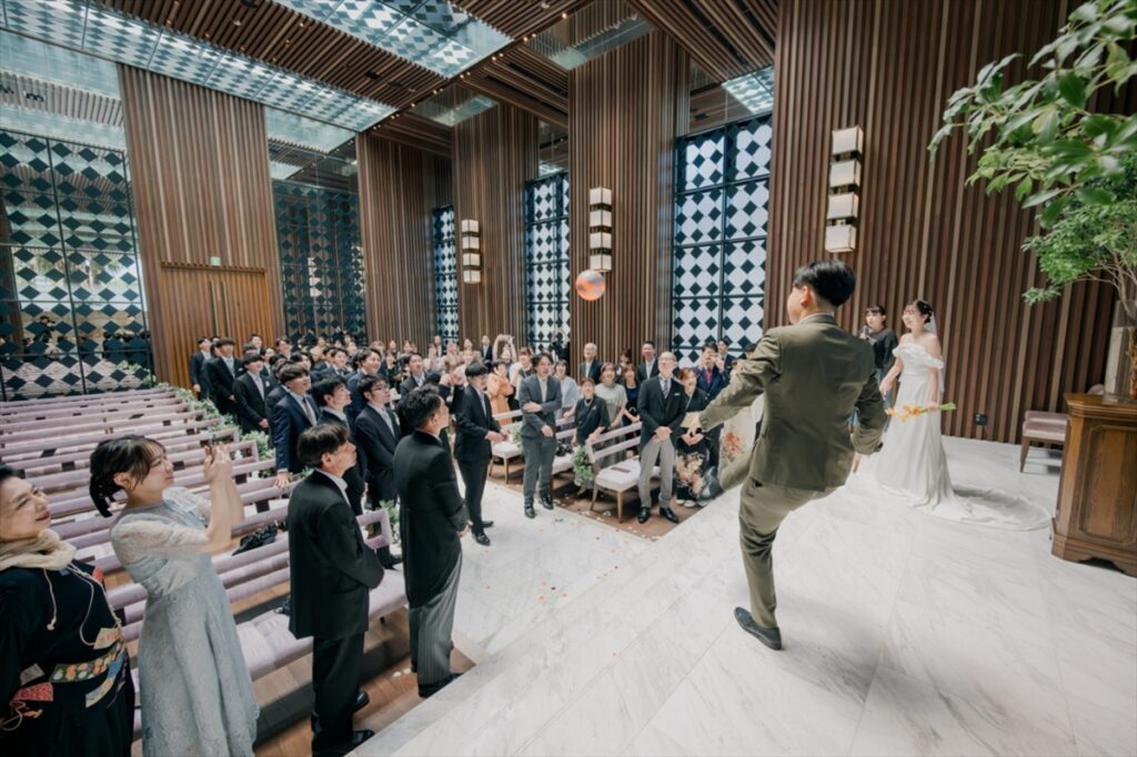 ここからはおふたりからゲストの皆さまへ、おもてなしの時間です!あおいさんからは手作りのお菓子ブーケトス、かいさんからは小さい頃からやっていたサッカーボールトスで、見事ボールをキャッチされた方にはカップラーメンブーケをプレゼントしました♪
