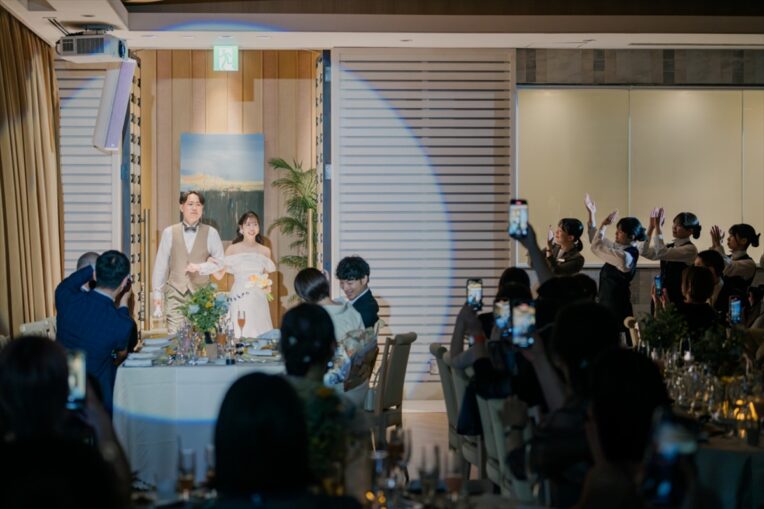 いよいよパーティーのスタートです!待ちに待ったお写真のお時間では、直接おふたりへ「おめでとう」の言葉を届けていただきました。