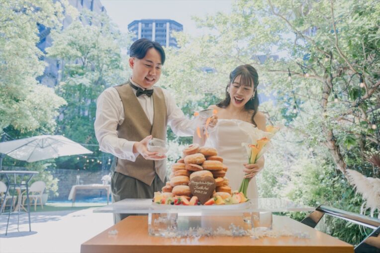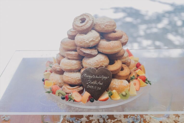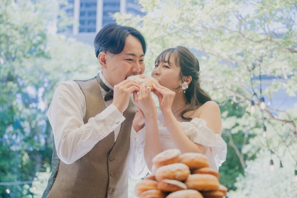 メインイベントのケーキセレモニーでは、ドーナツタワーが登場。おふたりで最後の仕上げにお砂糖をかけ、完成させます。ファーストバイトも、もちろん大きいドーナツにかぶりつきます!おふたりらしさ満載のケーキイベントにゲストの皆さまもカメラのシャッターが止まりません。