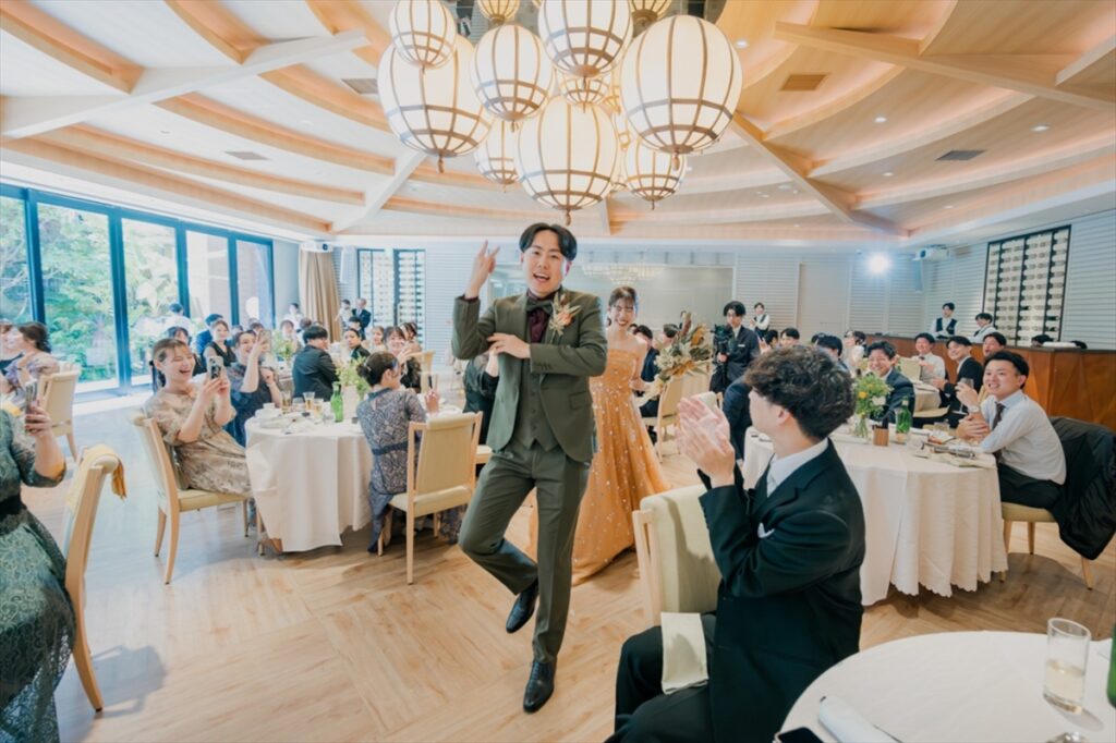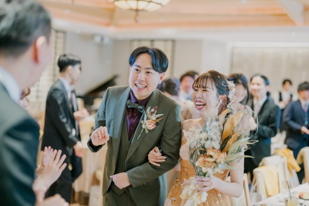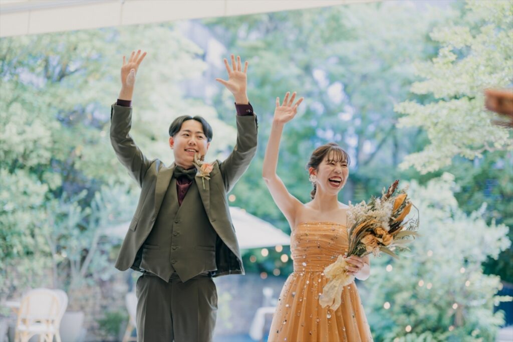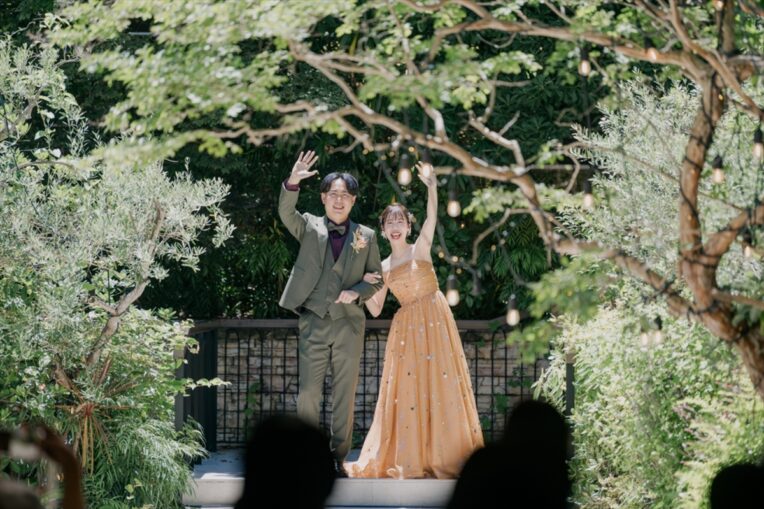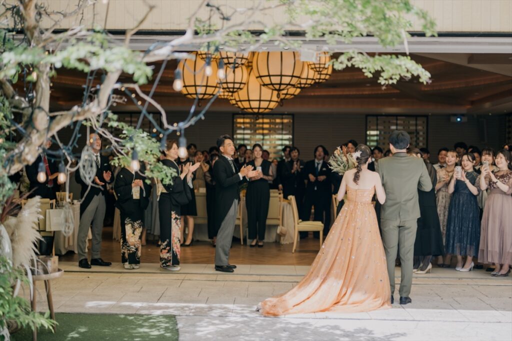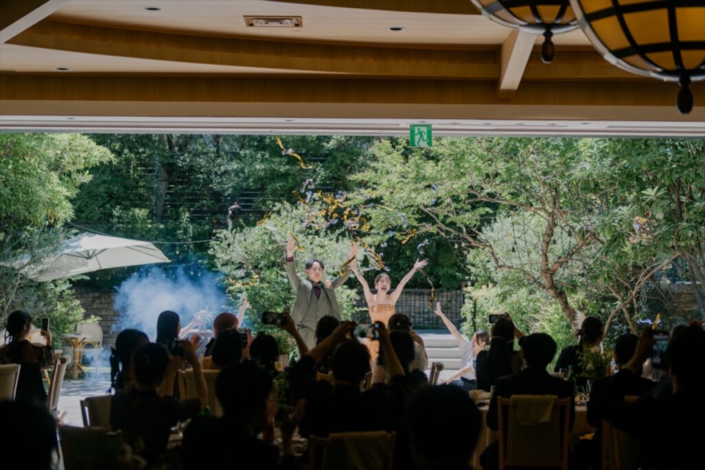 お色直しとともにラピスアジュール自慢のガーデンからの入場です!お家でたくさん練習を重ねてくださったおふたり。サビではダンスを披露し、会場をより一層盛り上げます。