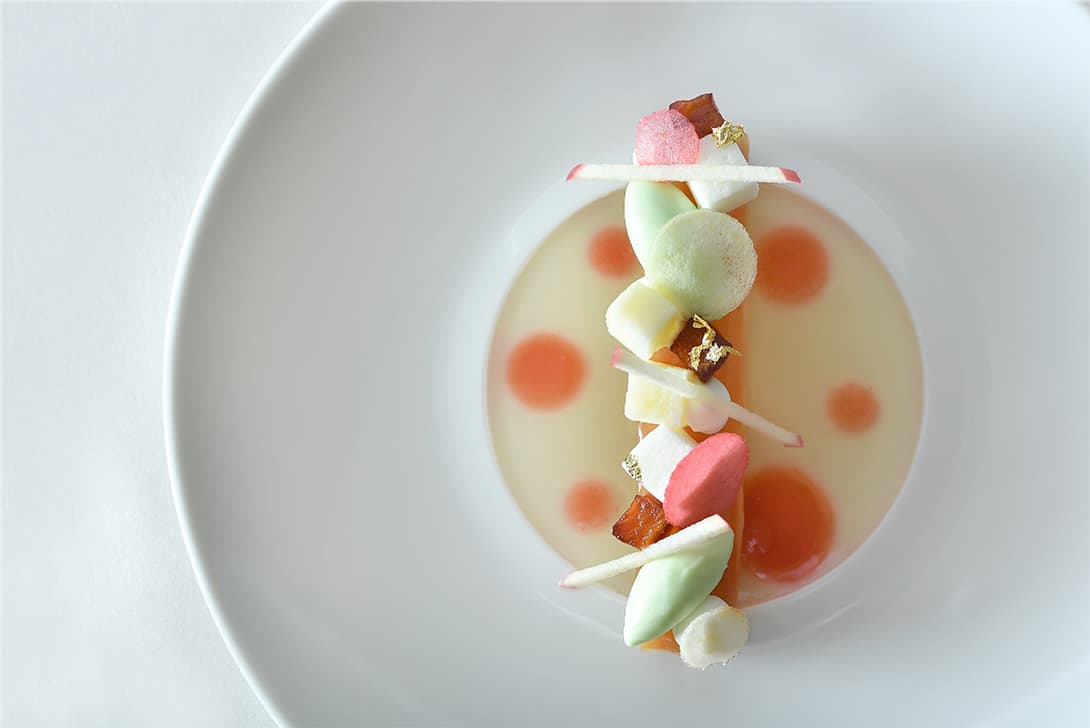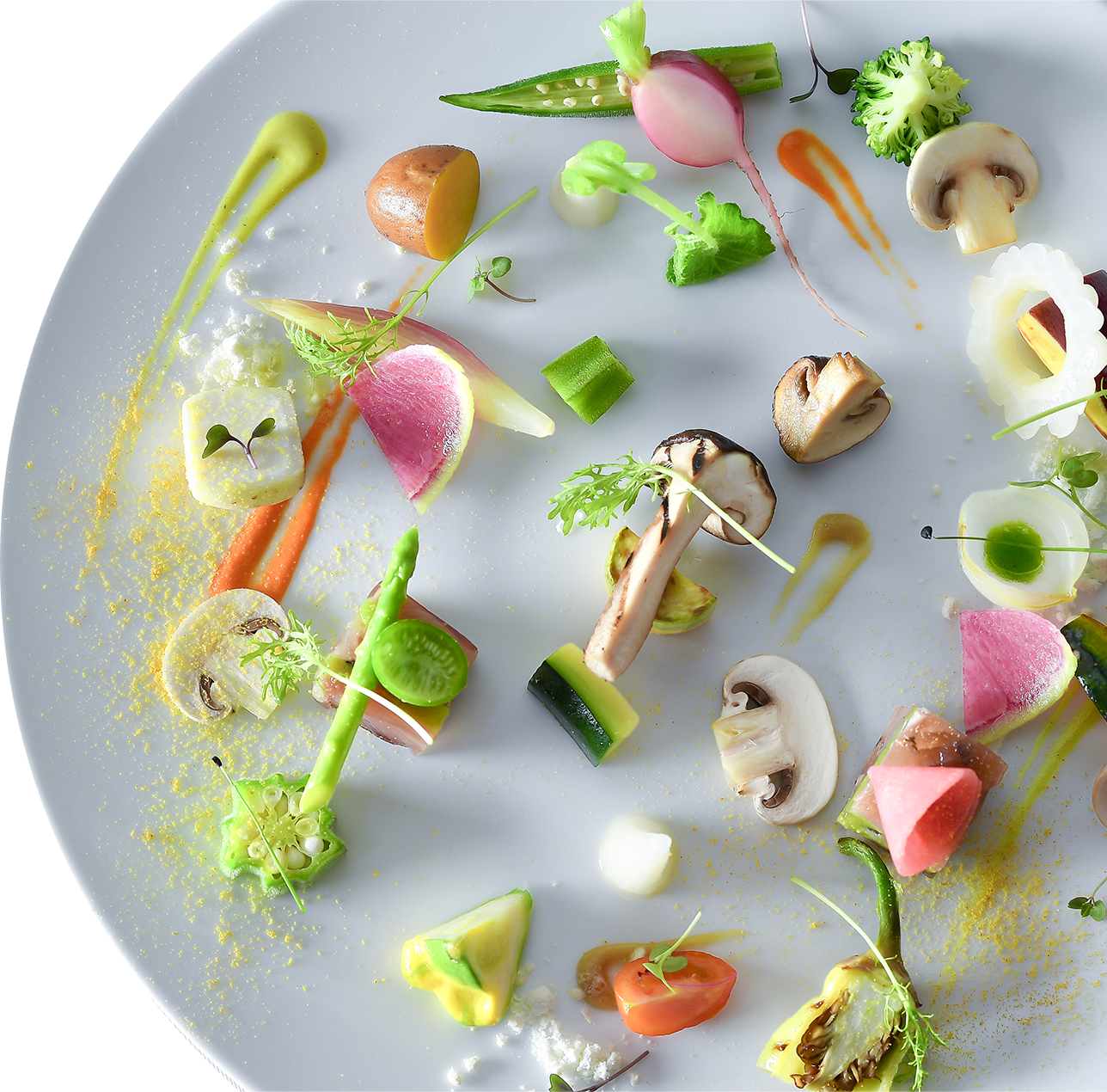その日に仕入れた旬の季節の野菜を、その時の最も美味しくいただける調理法で、彩りも鮮やかな一皿に仕上げます。仕入れる素材は毎日異なるため、2つとして同じものは無い「その日だけの特別なメニュー」となります。シェフのインスピレーションと静岡野菜のマリアージュから生みだされる「物語」をぜひお楽しみください。