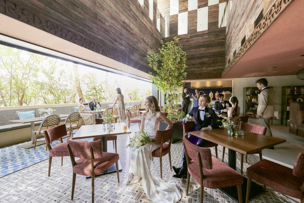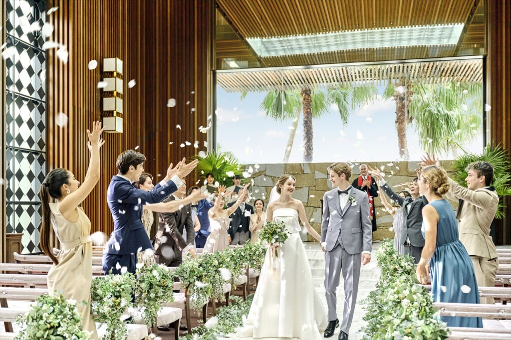 陽光に包まれたリゾートチャペル。ゲストとの距離が近い空間で、あたたかな祝福を間近に感じながら、夫婦の誓いを立てていただけます。